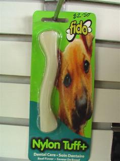 | Fido mini chew Superflex Extra Tuff Nylon Tuff+ Designed to reduce plaque formation in your dog's mouth. Used regularly it will help Made from nylon this product is non-toxic. Infused with a beef flavour which slowly releases throughout the life of the product. 11cm $2.50 |