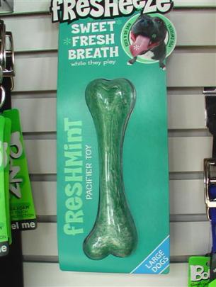 | Freshmint pacifier toy Sweet fresh breath while they play Phew! dog breath can be pretty awful. Now fresheeze is the easy and fun way to freshen breath while dogs play. 19cm $10.80 |